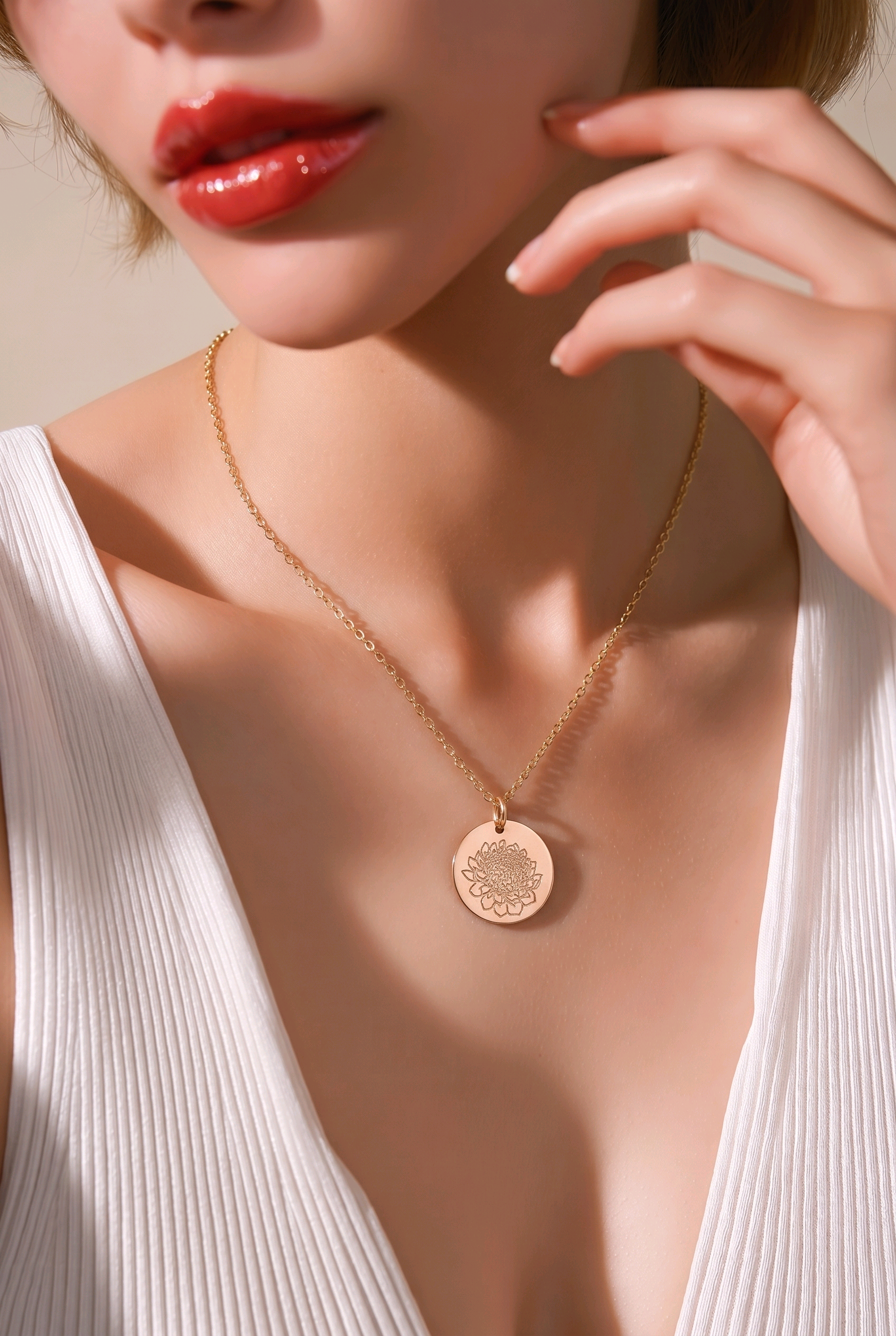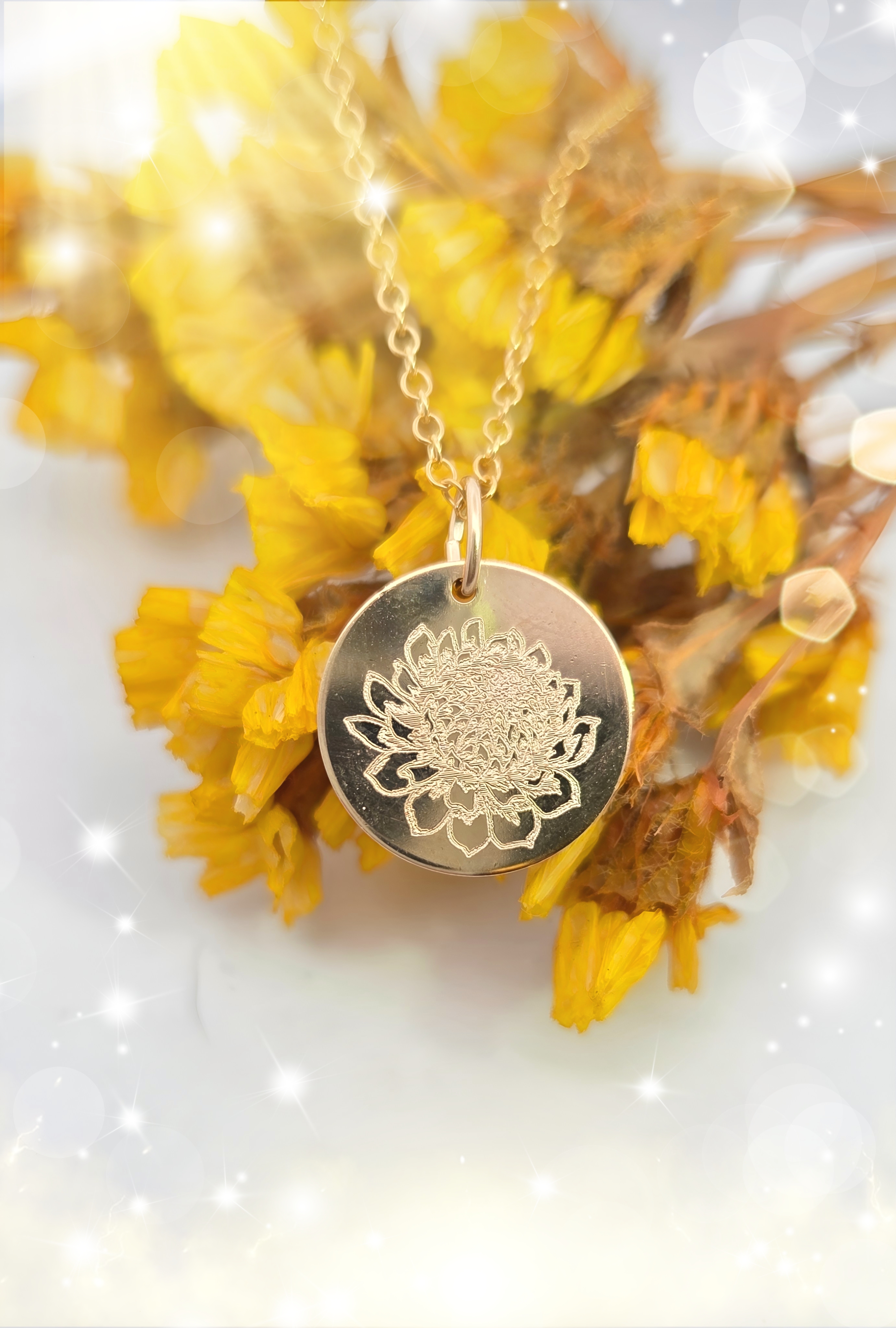 Dieser runde Anhänger aus hochwertigem Goldfilled besticht durch seine zeitlose Eleganz und liebevolle Detailarbeit. Mit einem Durchmesser von ca. 16 mm trägt er die zarte Diamantgravur einer Chrysanthemenblüte – ein Symbol für Schönheit, Lebensfreude und Beständigkeit.