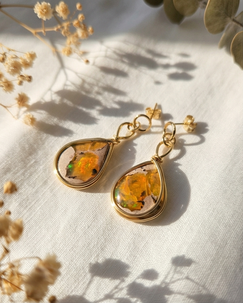 Die Steine sind sorgfältig von Hand mit 14 kt goldfilled Draht gewickelt. Die schlichte Fassung unterstreicht die organische Form der Feueropale und lässt ihnen Raum, ihre individuelle Ausstrahlung voll zu entfalten. Ein zeitloses Schmuckstück, das sowohl im Alltag als auch zu besonderen Anlässen getragen werden kann.