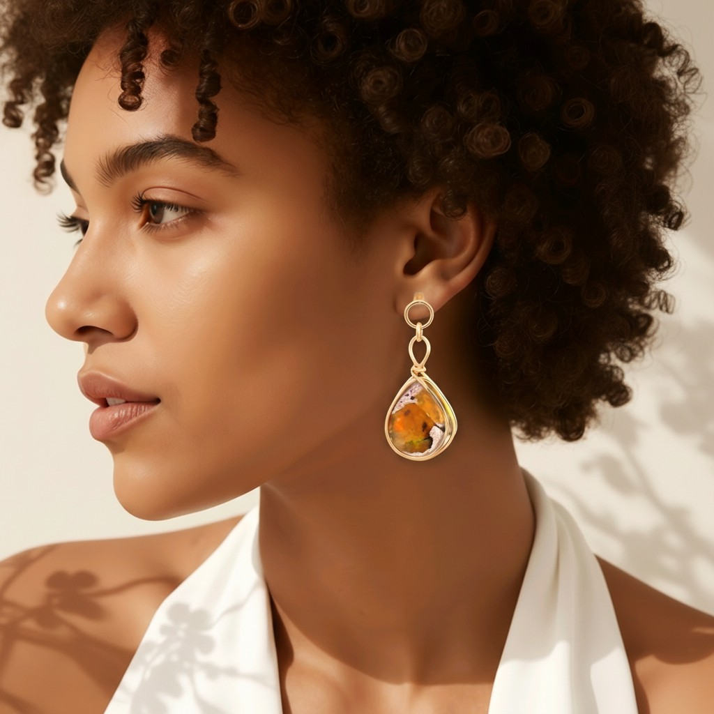 Diese eleganten Ohrringe vereinen zurückhaltendes Design mit der außergewöhnlichen Schönheit natürlicher Edelsteine. Tropfenförmige mexikanische Feueropale in Matrix stehen im Mittelpunkt und begeistern durch ihr warmes Farbspiel und ihre natürliche Struktur.
